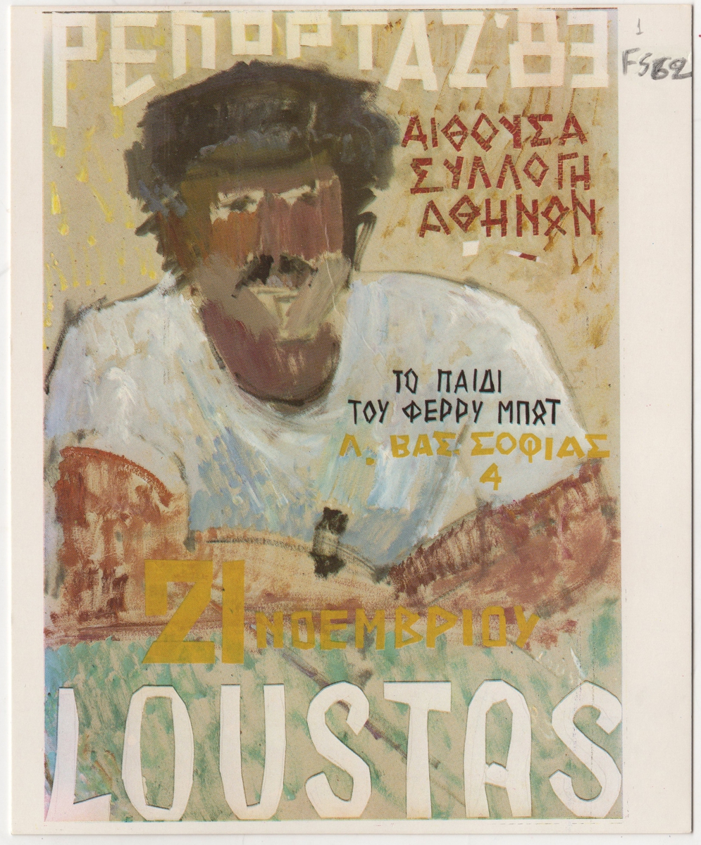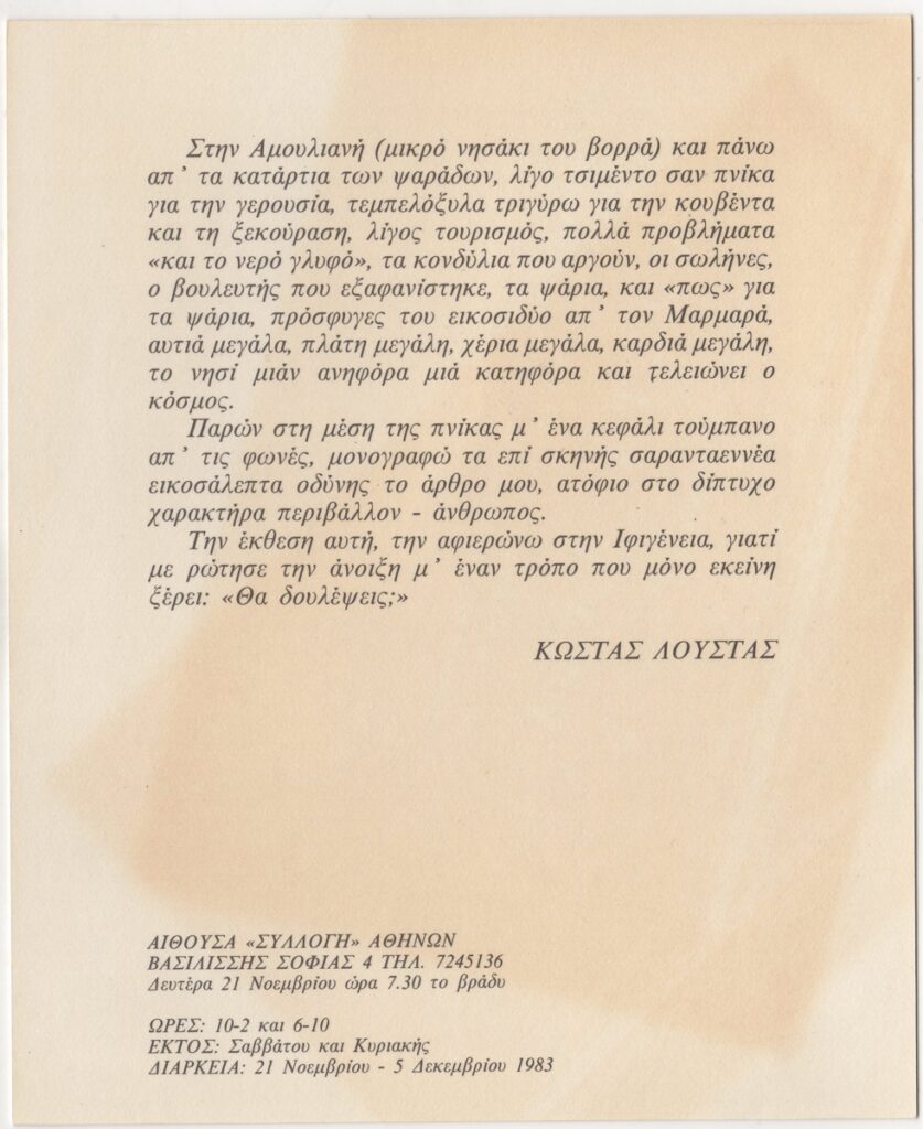 Πρόσκληση, χαρτόνι διπλής όψης, 18×14.5 εκ., στα ελληνικά, εγκαινίων ατομικής έκθεσης ζωγραφικής του Κώστα Λούστα. Περιέχει κείμενο του καλλιτέχνη και εικονογράφηση.