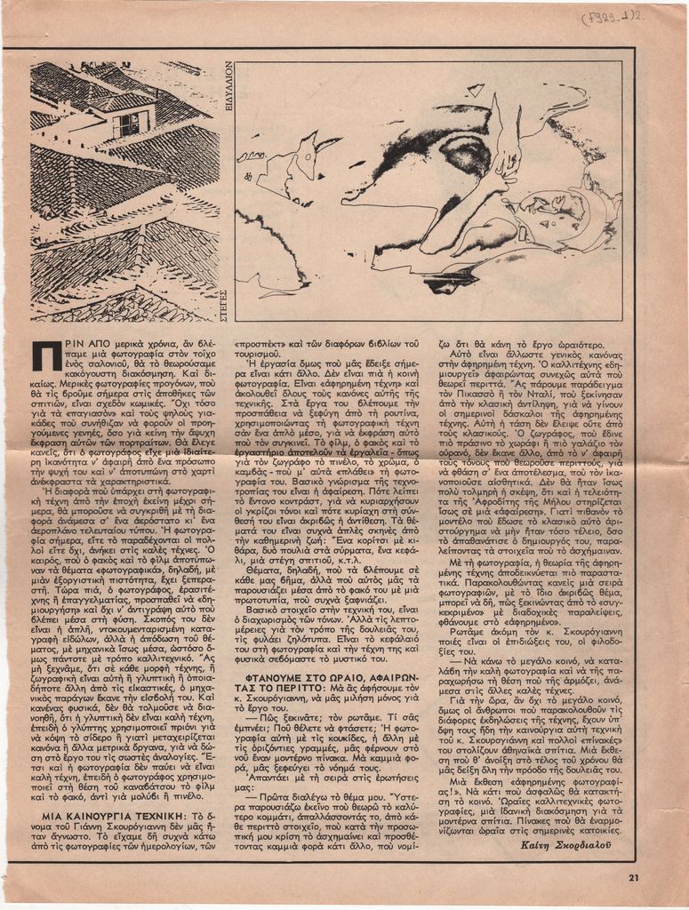 Απόκομμα, έντυπο, χαρτί, 2 φφ., 31,0×23,5 εκ., όπου δημοσιεύεται, στα ελληνικά, άρθρο της Καίτης Σκορδαλιού για το εικαστικό έργο του φωτογράφου Γιάννη Σκουρογιάννη. Επάνω, επιγραφή.