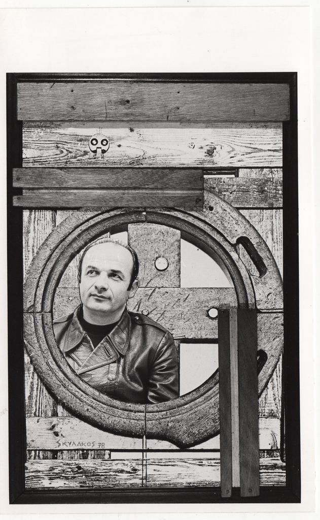 Φωτογραφία, α/μ, φωτογραφικό χαρτί, 20,4×12,7 εκ. Αναπαραγωγή αυτοπροσωπογραφίας – κολλάζ του Βασίλη Σκυλάκου. Στην πίσω όψη, επιγραφή με τα στοιχεία του έργου και σφραγίδα του φωτογράφου Γιώργου Δίπλα.
