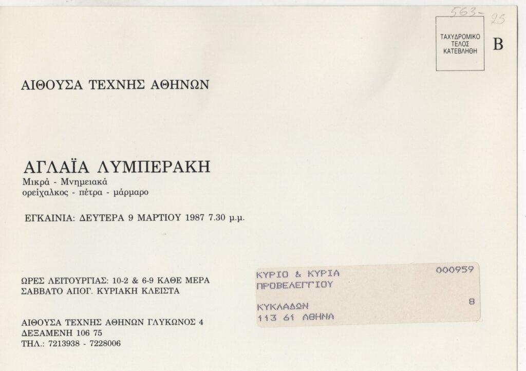 Πρόσκληση, χαρτί ιλλουστρασιόν, 20,5×15,5 εκ., στα ελληνικά, ατομικής έκθεσης γλυπτικής της Αγλαΐας Λυμπεράκη. Το έντυπο εικονογραφείται και βρέθηκε απεσταλμένο στο ζεύγος Προβελέγγιου.