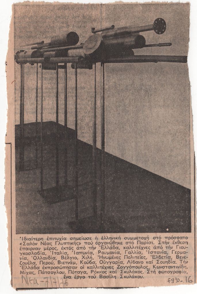 Απόκομμα, έντυπο, χαρτί, 16,7×10,3 εκ., όπου δημοσιεύεται, στα ελληνικά, σχόλιο για την υποδοχή της ελληνικής συμμετοχής στο “Salon de la jeune sculpture” στο Παρίσι το 1976 με συμμετοχή των Ζογγολόπουλου, Κωνσταντινίδη, Μίχα, Πάτσογλου, Πόταγα, Ρόκκου και Σκυλάκου. Κάτω, επιγραφή με τα στοιχεία της δημοσίευσης.