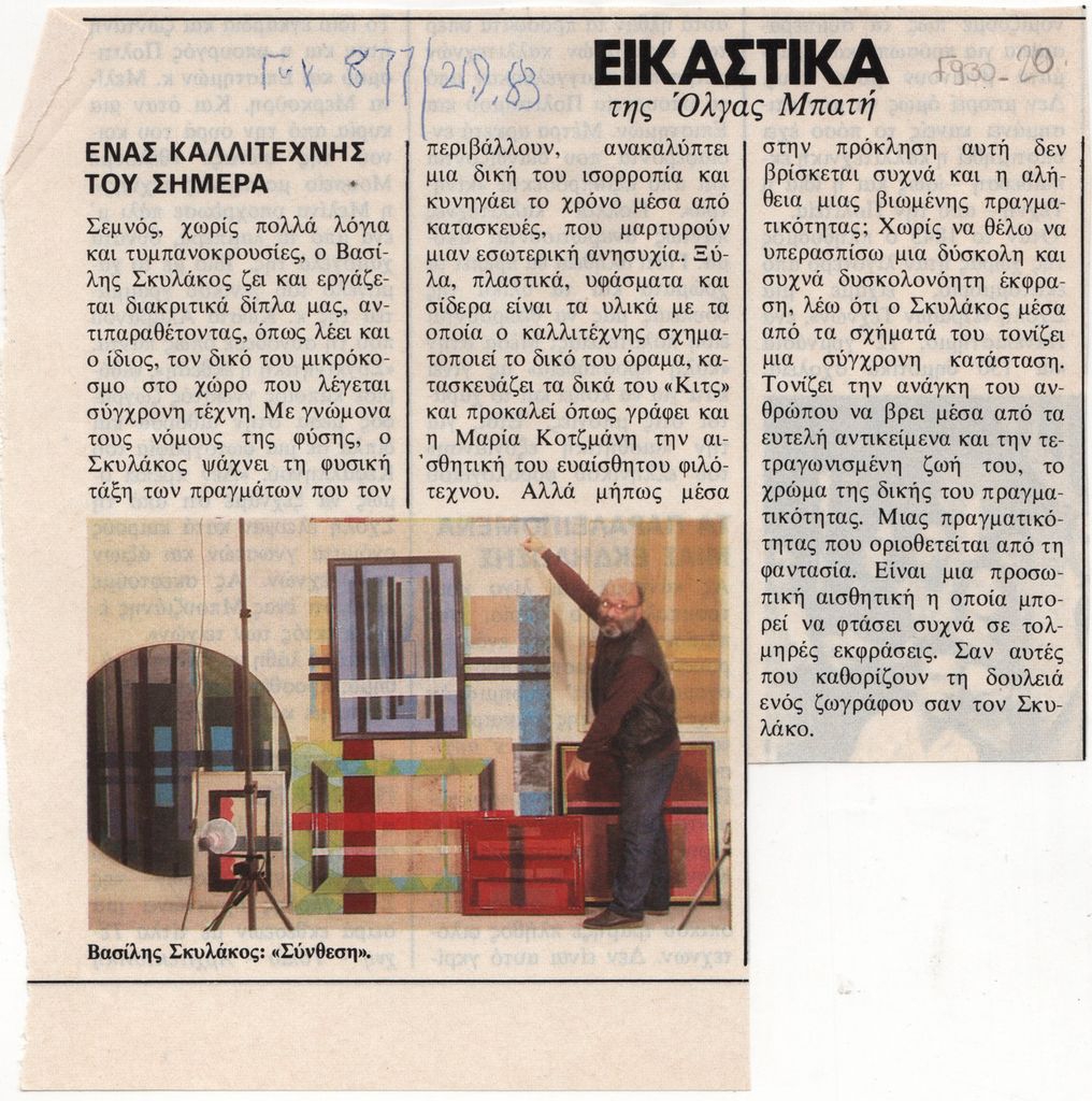 Απόκομμα, έντυπο, χαρτί ιλουστρασιόν, 14,5×14,5 (ακανόνιστο σχήμα), όπου δημοσιεύεται, στα ελληνικά, κριτική της Όλγας Μπατή για το έργο του Βασίλη Σκυλάκου. Επάνω, επιγραφή με τα στοιχεία της δημοσίευσης.