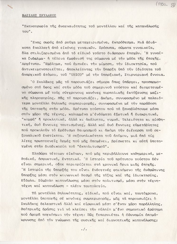 Κείμενο, δακτυλόγραφο, στα ελληνικά, χαρτί, 4 φφ., 28,8×21,0 εκ. Κείμενο της Έφης Στρούζα για το έργο του Βασίλη Σκυλάκου. Αποτελεί πιθανόν μέρος του έντυπου υλικού της ατομικής έκθεσης του Β. Σκυλάκου στην Αθήνα το 1979.