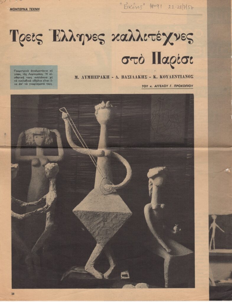Απόκομμα, χαρτί, 3 φφ, 32,5×24,5 εκ., στα ελληνικά, δημοσίευσης άρθρου αναφερόμενου στους Λυμπεράκη, Βασιλάκη (Τάκη), Κουλεντιάνο, τη ζωή τους στο Παρίσι και το έργο τους ως εκπροσώπους των Ελλήνων απόδημων καλλιτεχνών. Δίνονται βιογραφικές πληροφορίες.