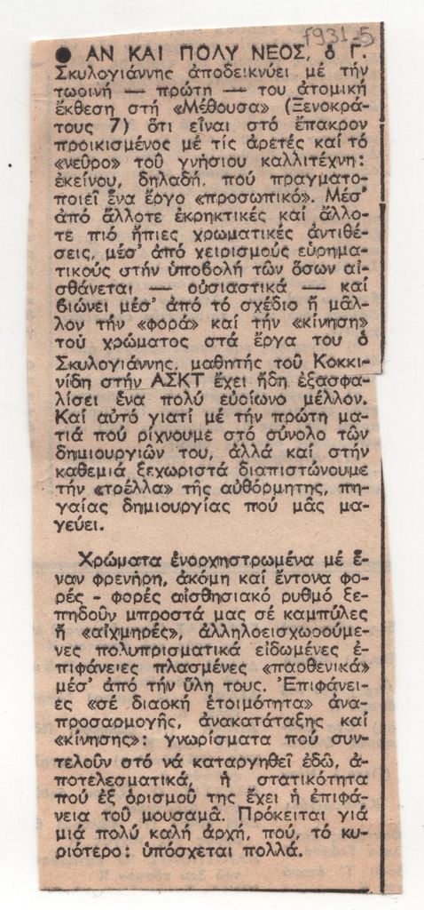 Απόκομμα, έντυπο, χαρτί, 12,7×5,2 εκ., όπου δημοσιεύεται, στα ελληνικά, κριτική της ατομικής έκθεσης του Γιώργου Σκυλογιάννη στην Γκαλερί Μέδουσα στην Αθήνα [πιθανόν το 1981].