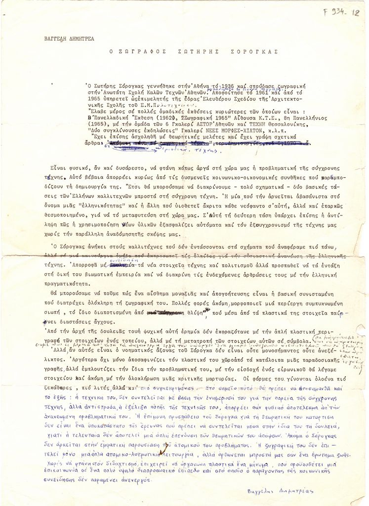Κείμενο, δακτυλόγραφο και χειρόγραφο, χαρτί, 34,5×25 εκ., στα ελληνικά, που αποτελεί κριτική για το εικαστικό έργο του Σωτήρη Σόρογκα. Δίνεται βιογραφικό σημείωμα του καλλιτέχνη.