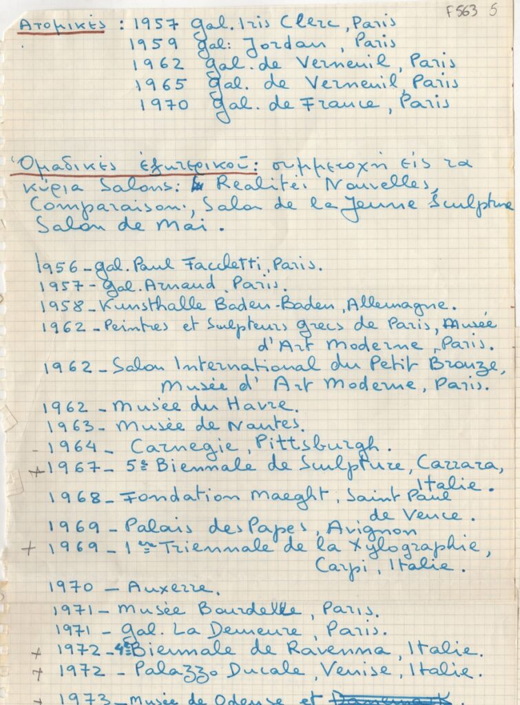 Λίστα, χειρόγραφο, χαρτί, 78,5×21 εκ., στα ελληνικά, εκθέσεων της Αγλαΐας Λυμπεράκη. Περιέχει βιβλιογραφία και λίστα συλλογών όπου φυλάσσονται τα έργα της.