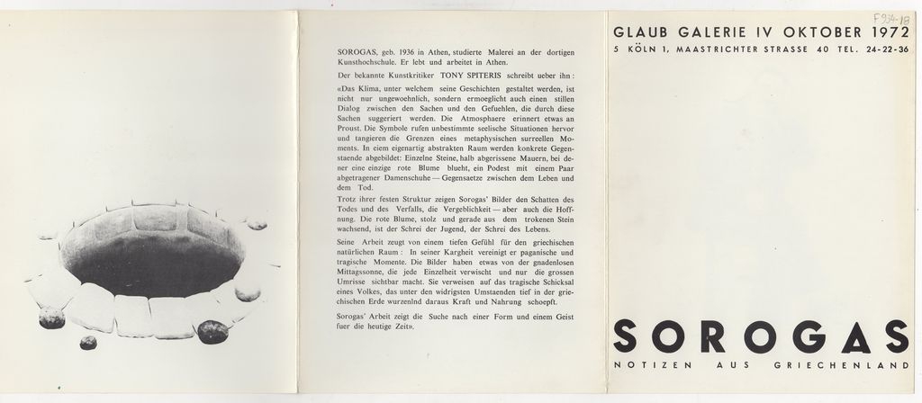 Έντυπο, χαρτόνι δίπτυχο,17.5×14 εκ., στα γερμανικά, έκθεσης του Σωτήρη Σόρογκα.