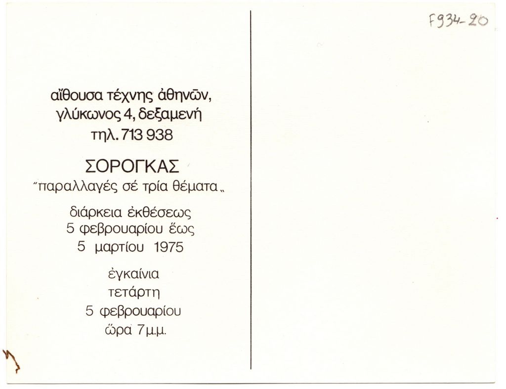 Πρόσκληση, χαρτόνι, 14×18 εκ., στα ελληνικά, εγκαινίων έκθεσης ζωγραφικής του Σωτήρη Σόρογκα.