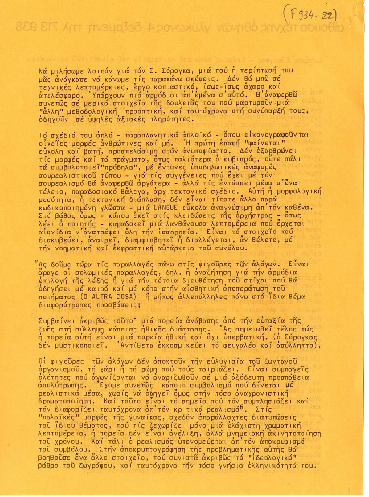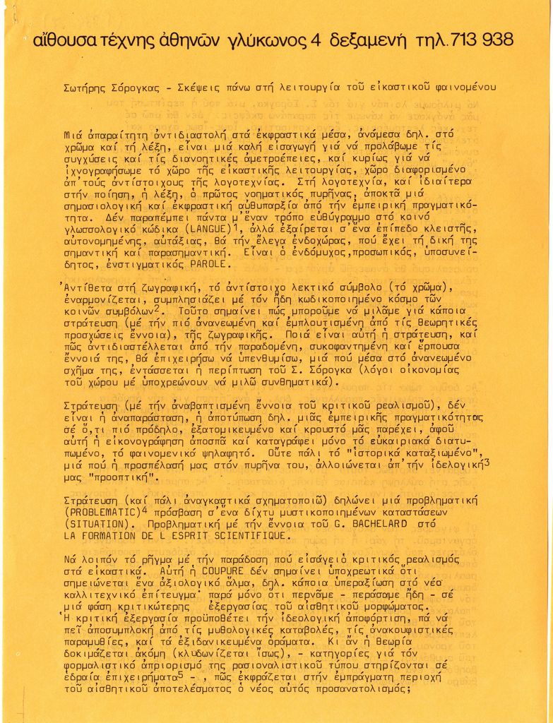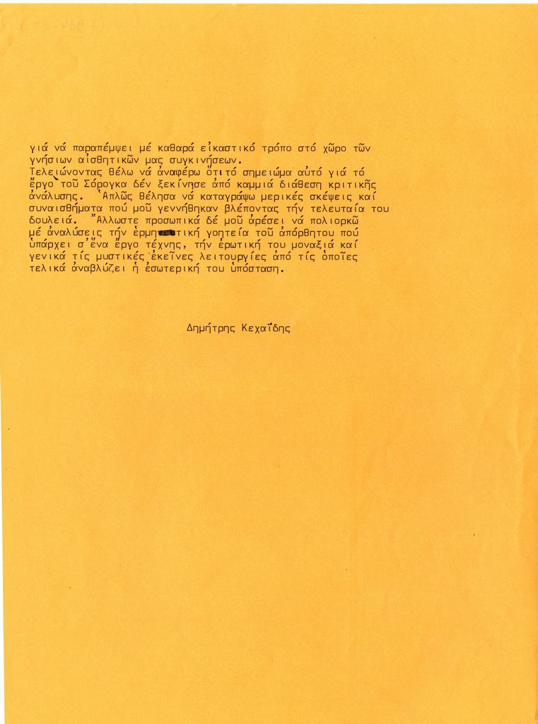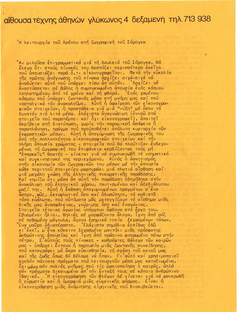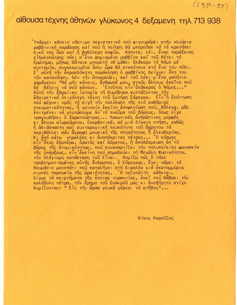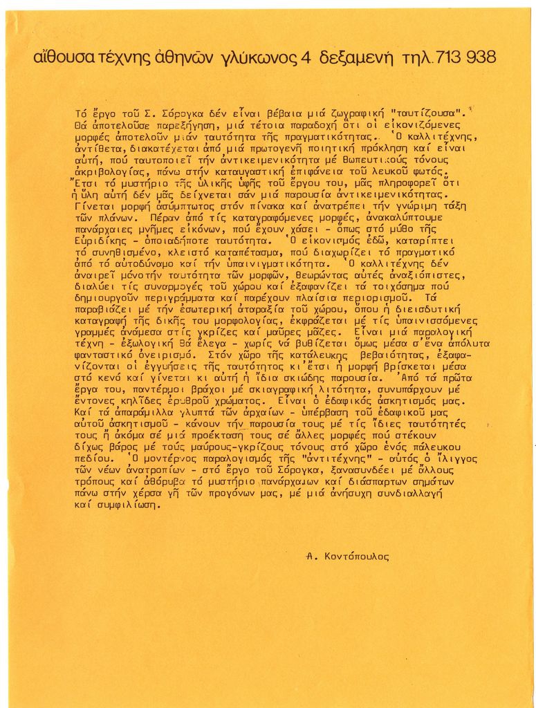 Έντυπο, δακτυλόγραφο, χαρτί, 15 φφ, 28×21 εκ., στα ελληνικά, έκθεσης ζωγραφικής του Σωτήρη Σόρογκα.