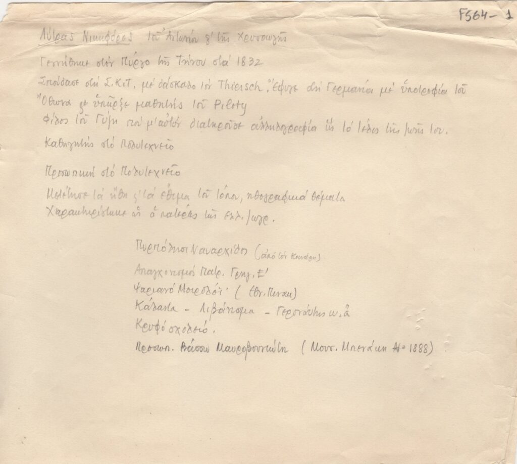 Βιογραφικό, χειρόγραφο, χαρτί, 19×21,5 εκ., στα ελληνικά, του Νικηφόρου Λύτρα. Περιέχει σπουδές και έργα.
