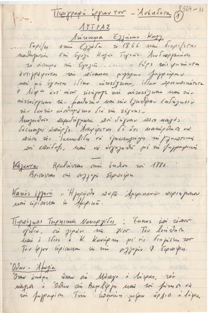 Αποδελτίωση, χειρόγραφη, χαρτί, 4 φφ, 29,5×21 εκ., στα ελληνικά, για τον Νικηφόρο Λύτρα από το “Λεύκωμα Ελλήνων Καλλιτεχνών”.