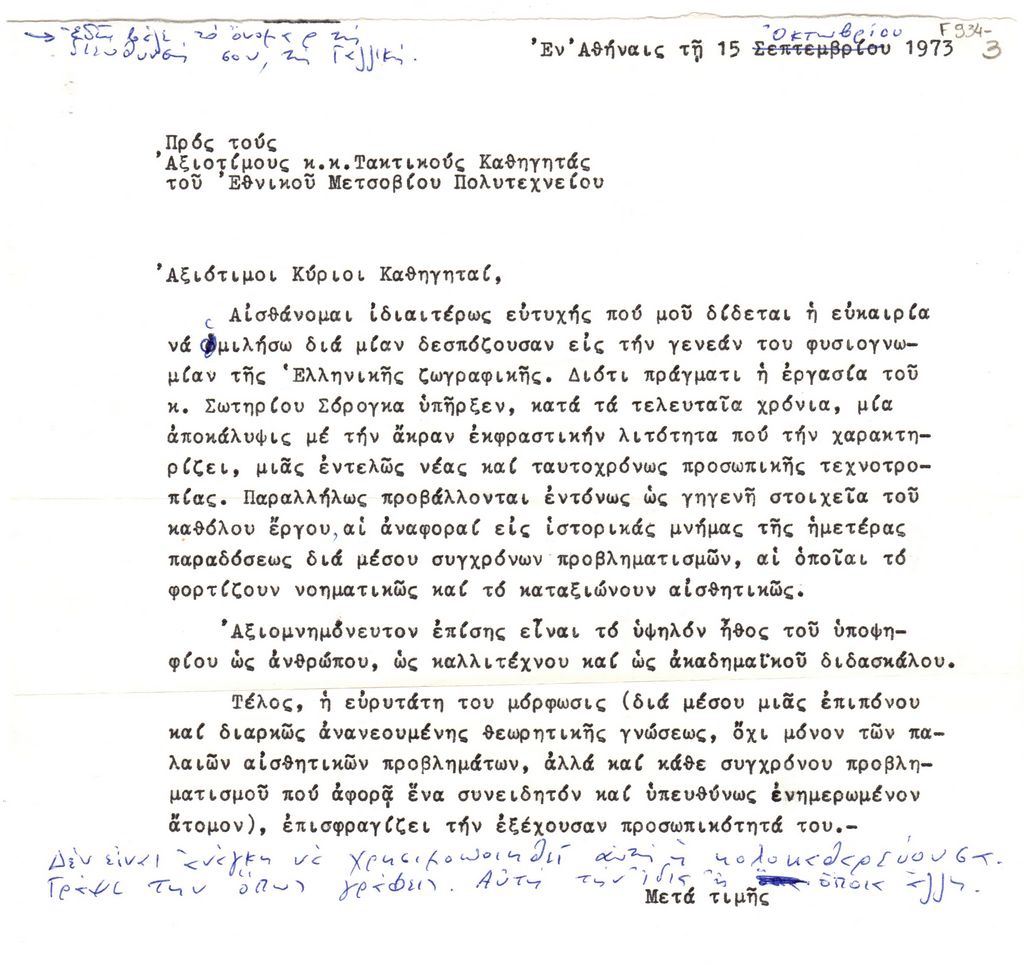 Πρόκειται για συστατική επιστολή που συνέταξε ο Σωτήρης Σόρογκας για τον εαυτό του, η οποία αποτελεί προσχέδιο αντίστοιχης που επιθυμεί να συντάξει γι ‘αυτόν ο Τώνης Σπητέρης.