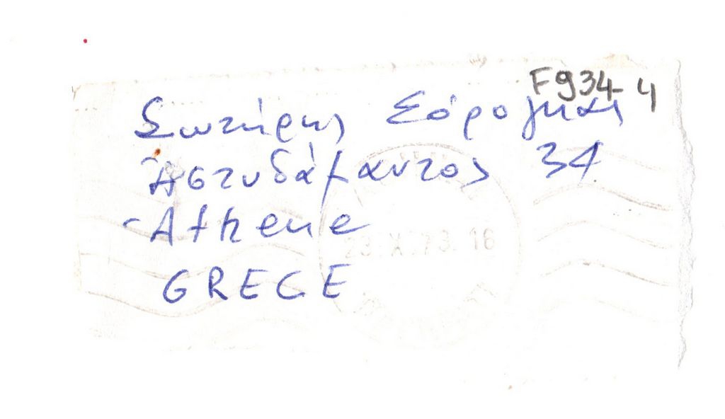 Απόκομμα φακέλου με αναγραφόμενα στοιχεία αλληλογραφίας του Σωτήρη Σόρογκα