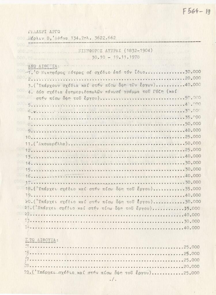 Τιμοκατάλογος, χαρτί, δακτυλόγραφο, 29×21 εκ., στα ελληνικά, έργων ατομικής έκθεσης του Νικηφόρου Λύτρα.