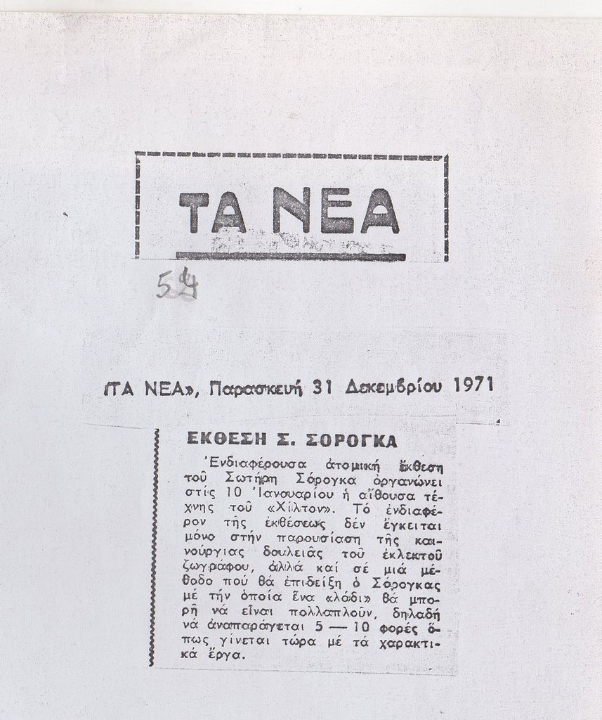 Φωτοαντίγραφο, χαρτί, 29.5×21 εκ., στα ελληνικά, δημοσίευσης αναγγελίας έκθεσης του Σωτήρη Σόρογκα στην Αίθουσα Τέχνης Αθηνών Χίλτον.