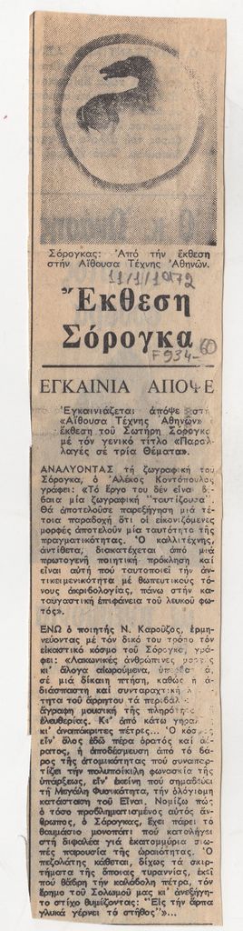 Απόκομμα, χαρτί, 24×5 εκ., στα ελληνικά, δημοσίευσης αναφερόμενης στα εγκαίνια έκθεσης του Σωτήρη Σόρογκα στην Αίθουσα Τέχνης Αθηνών Χίλτον.