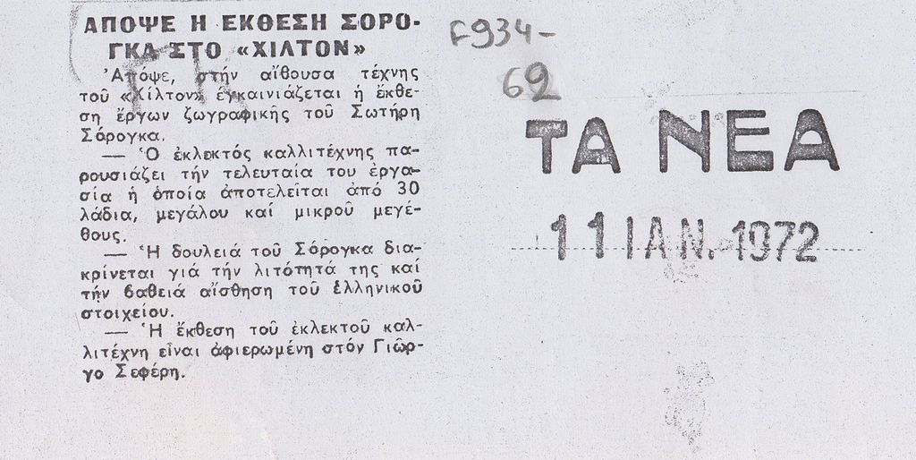Φωτοαντίγραφο, χαρτί, 29.5×21 εκ., στα ελληνικά, δημοσίευσης αναγγελίας έκθεσης του Σωτήρη Σόρογκα στην Αίθουσα Τέχνης Αθηνών Χίλτον.