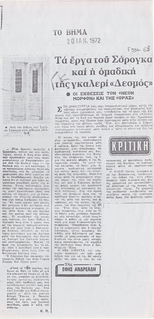 Φωτοαντίγραφο, χαρτί, 29.5×21 εκ., στα ελληνικά, δημοσίευσης κριτικής έκθεσης του Σωτήρη Σόρογκα, η οποία διεξάγεται στην Αίθουσα Τέχνης Αθηνών Χίλτον. Στο ίδιο, απόσπασμα κριτικής έκθεσης της Κλειώς Νάτση στην γκαλερί Νέες Μορφές στην Αθήνα.