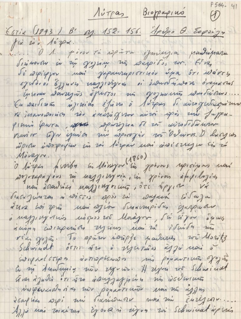 Αποδελτίωση, χειρόγραφη, χαρτί, 2 φφ, 28,5×21 εκ., στα ελληνικά, πηγής για τον Νικηφόρο Λύτρα.