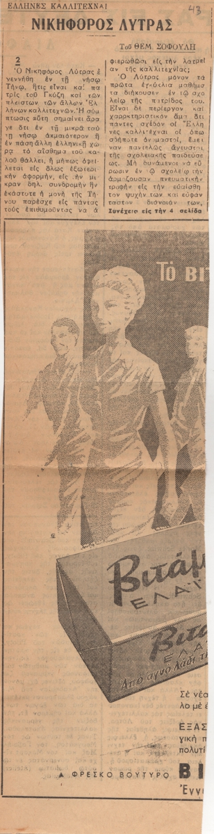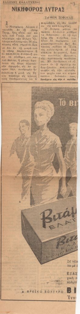 Απόκομμα, χαρτί, 40×10 εκ., στα ελληνικά, δημοσίευσης άρθου αναφερόμενου στη ζωή και το εικαστικό έργο του Νικηφόρου Λύτρα. Εντάσσεται στη στήλη “‘Ελληνες Καλλιτέχναι”.