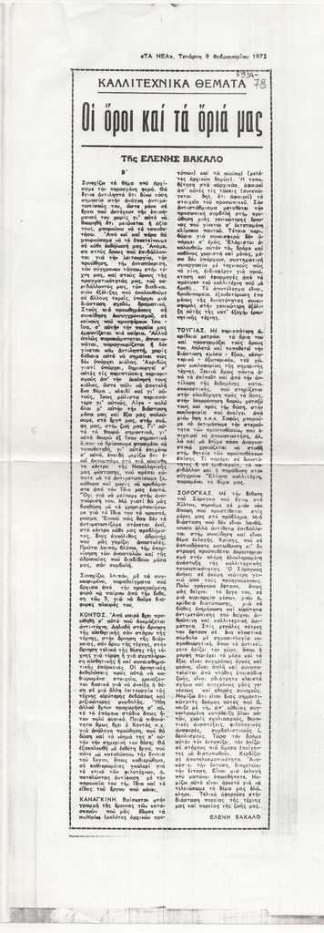 Φωτοαντίγραφο, χαρτί, 42×30 εκ., στα ελληνικά, δημοσίευσης κριτικής εκθέσεων της περιόδου στην Αθήνα. Ειδικότερα, η Ελένη Βακαλό σχολιάζει ομαδική έκθεση των Κοντού, Καναγκίνη, Καρά, Τούγια, Μυταρά στην Αίθουσα Τέχνης Δεσμός στην Αθήνα. Στο παρόν εστιάζει στους Κοντό, Καναγκίνη και Τούγια, ενώ σχολιάζει επίσης την έκθεση ζωγραφικής του Σωτήρη Σόρογκα στην Αίθουσα Τέχνης Αθηνών Χίλτον.