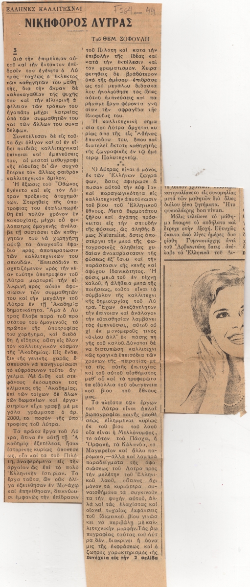 Απόκομμα, χαρτί, ακανόνιστου μεγέθους, στα ελληνικά, δημοσίευσης άρθρου αναφερόμενου στη ζωή και στο εικαστικό έργο του Νικηφόρου Λύτρα.