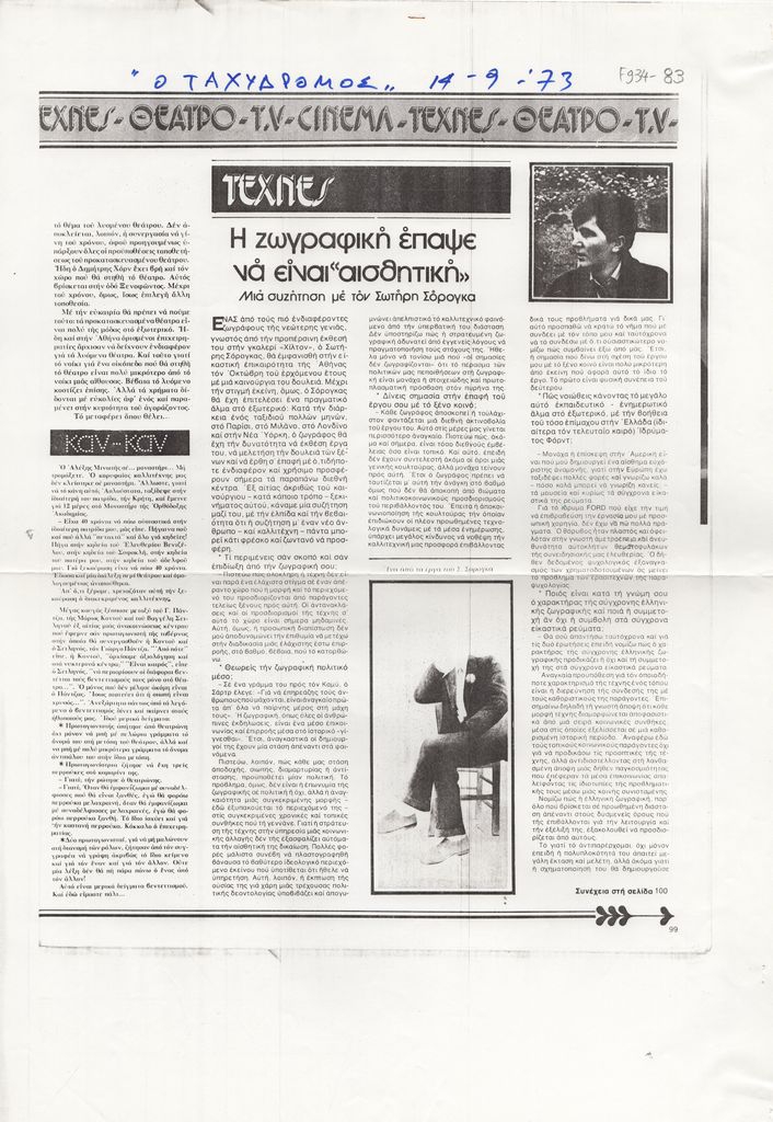 Φωτοαντίγραφο, χαρτί, 2 φφ, 42×30 και 14,5×7 εκ., στα ελληνικά, συνέντευξης του Σωτήρη Σόρογκα, στην οποία μιλά για τη ζωγραφική του.
