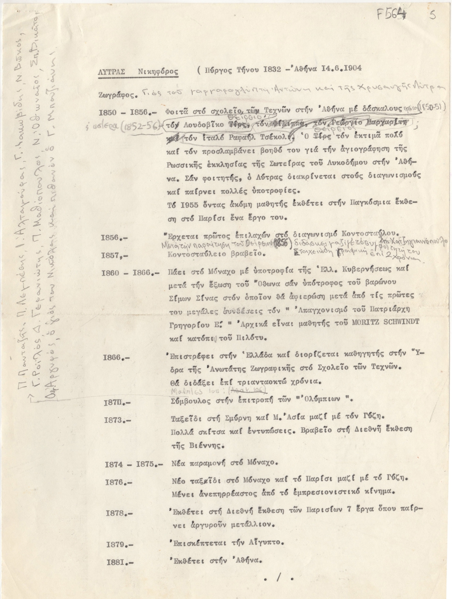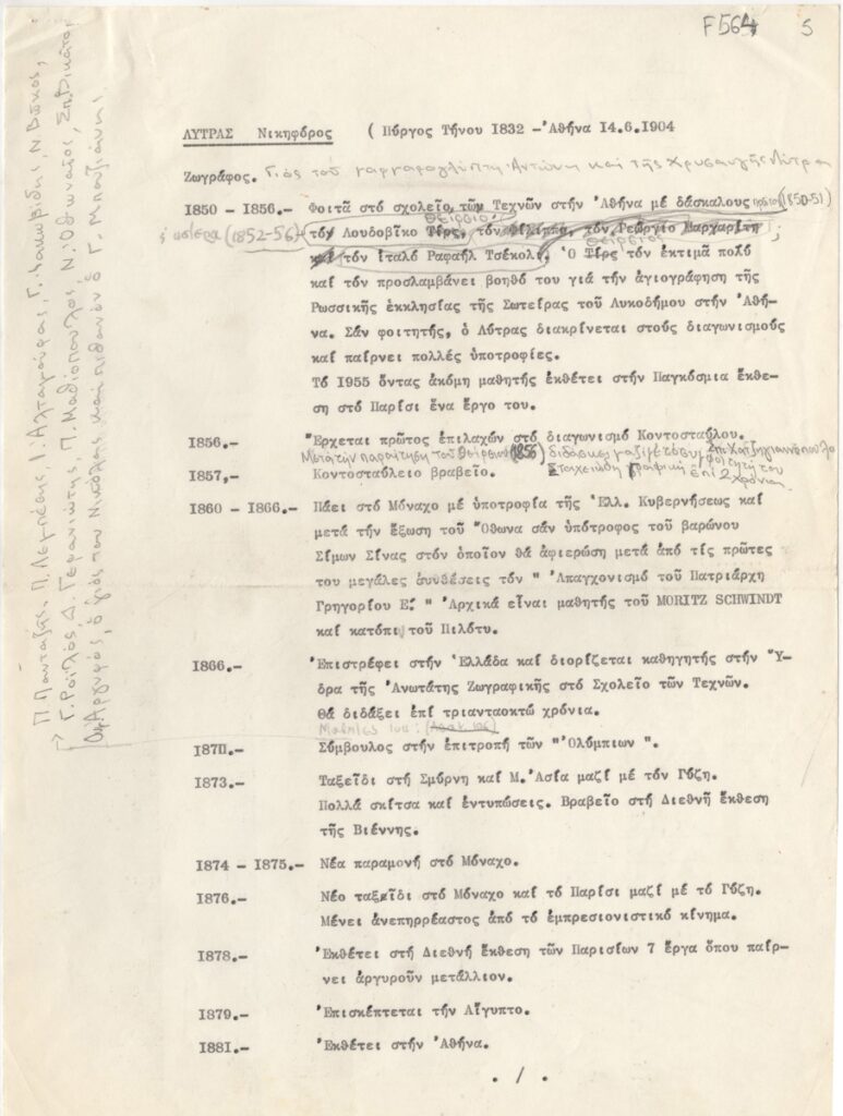 Βιογραφικό, δακτυλόγραφο, χαρτί, 2 φφ, 29×21 εκ., στα ελληνικά, του Νικηφόρου Λύτρα. Περιέχει σπουδές, ταξίδια, έργα, εκθέσεις, εργογραφία και βιβλιογραφία για τον καλλιτέχνη. Φέρει επιγραφές.