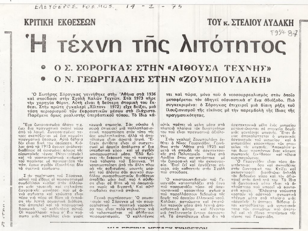 Φωτοαντίγραφο, χαρτί, 42×30 εκ., στα ελληνικά, δημοσίευσης κριτικής εκθέσεων του Σωτήρη Σόρογκα στην Αίθουσα Τέχνης Αθηνών και Νίκου Γεωργιάδη στην γκαλερί Ζουμπουλάκη. Δίνονται βιογραφικές πληροφορίες για τους καλλιτέχνες.