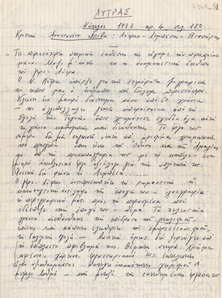 Αποδελτίωση, χειρόγραφο, χαρτί διπλής όψης, 28,5×21 εκ., στα ελληνικά, δημοσίευσης άρθρου για τον Νικηφόρο Λύτρα και το έργο του.