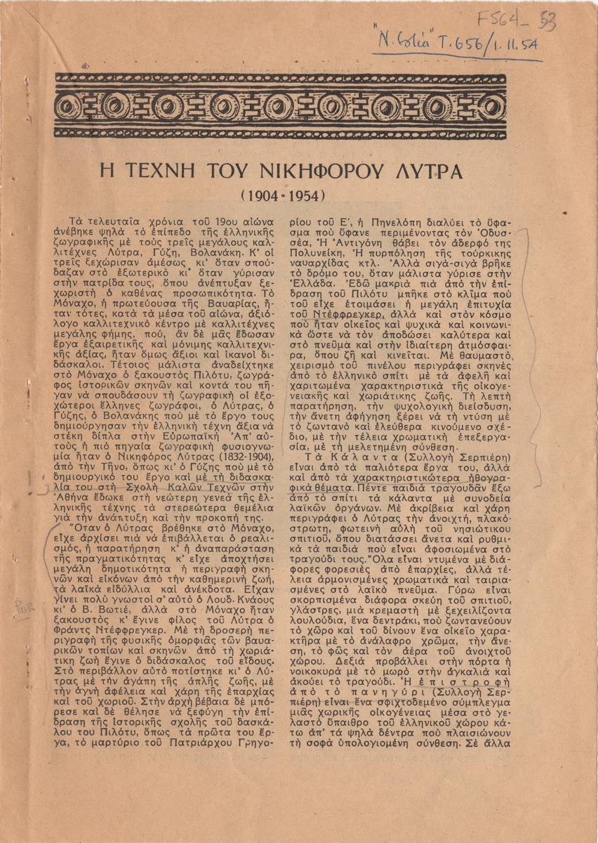 Απόκομμα, χαρτί, 2 φφ, 25×18 εκ., στα ελληνικά, δημοσίευσης άρθρου αναφερόμενου στο εικαστικό έργο του Νικηφόρου Λύτρα. Σχολιάζονται τα κυριώτερα έργα του.