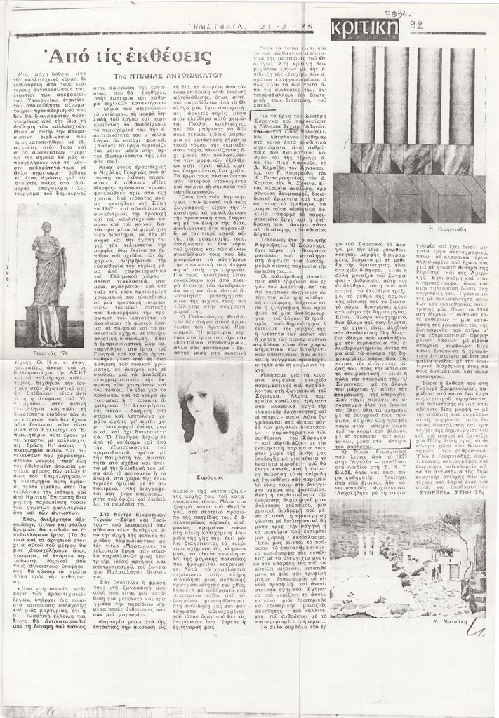 Ειδικότερα, σχολιάζονται οι εκθέσεις των: Μιχάλη Γεωργά στην γκαλερί Νέες Μορφές, Παλαιολόγου Θεολόγου στο Κέντρο Εικαστικών Τεχνών, Σωτήρη Σόρογκα στην Αίθουσα Τέχνης Αθηνών, Νίκου Γεωργιάδη στην γκαλερί Ζουμπουλάκη.