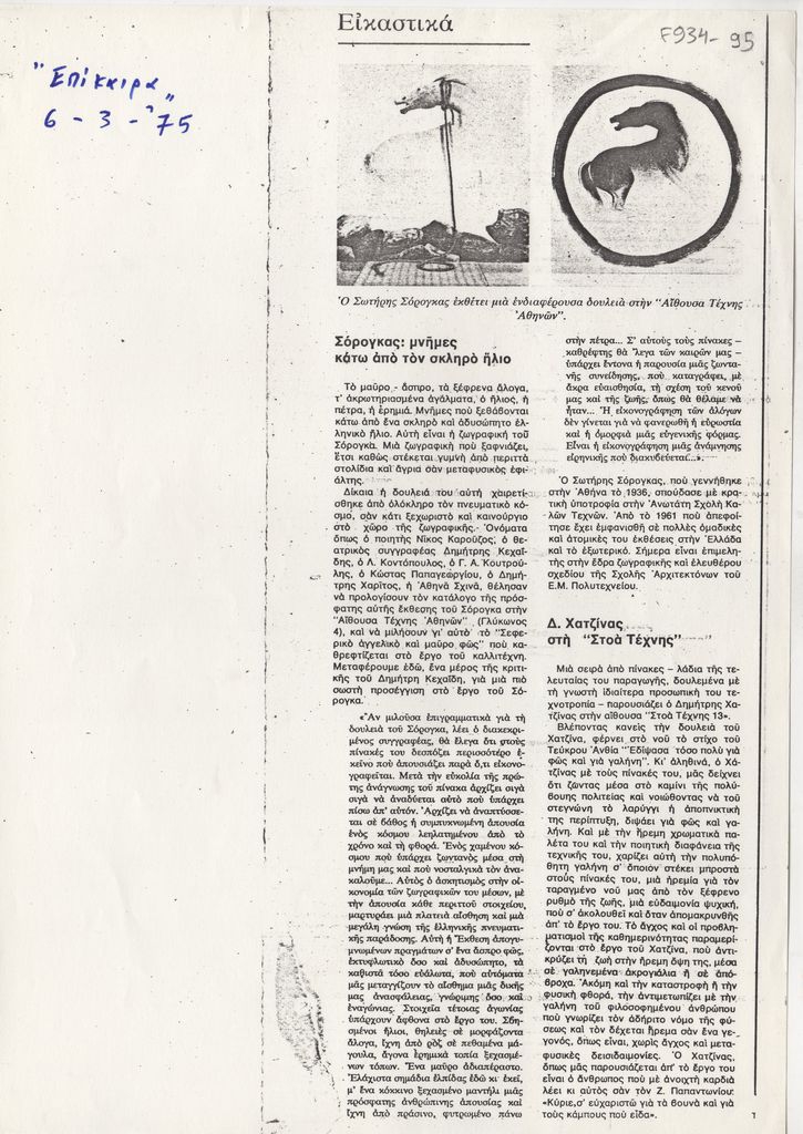 Φωτοαντίγραφο, χαρτί, 30×21 εκ., στα ελληνικά, δημοσίευσης κριτικής εκθέσεων του Σωτήρη Σόρογκα στην Αίθουσα Τέχνης Αθηνών και Δημήτρη Χατζίνα στην Αίθουσα Στοά Τέχνης 13.