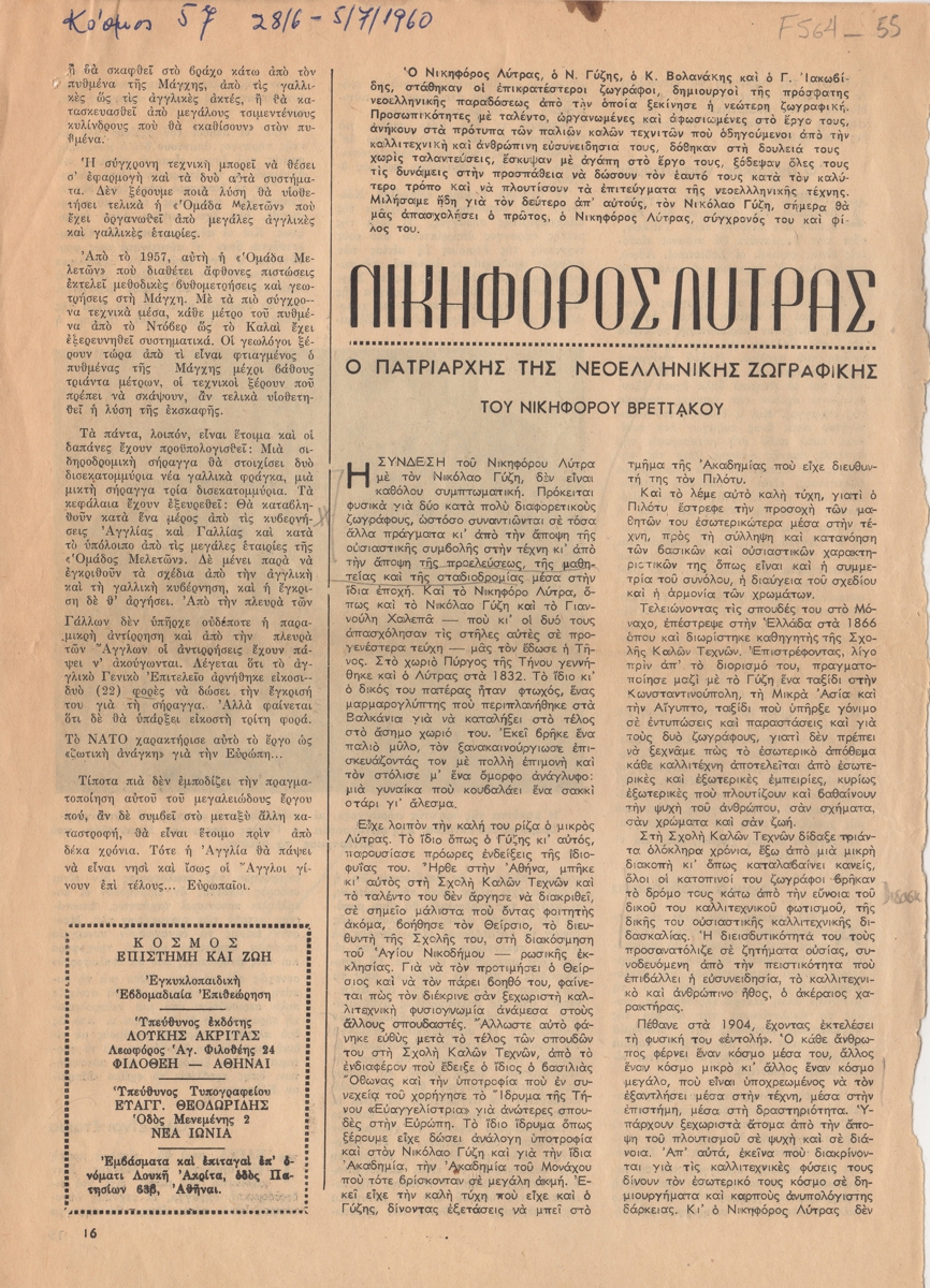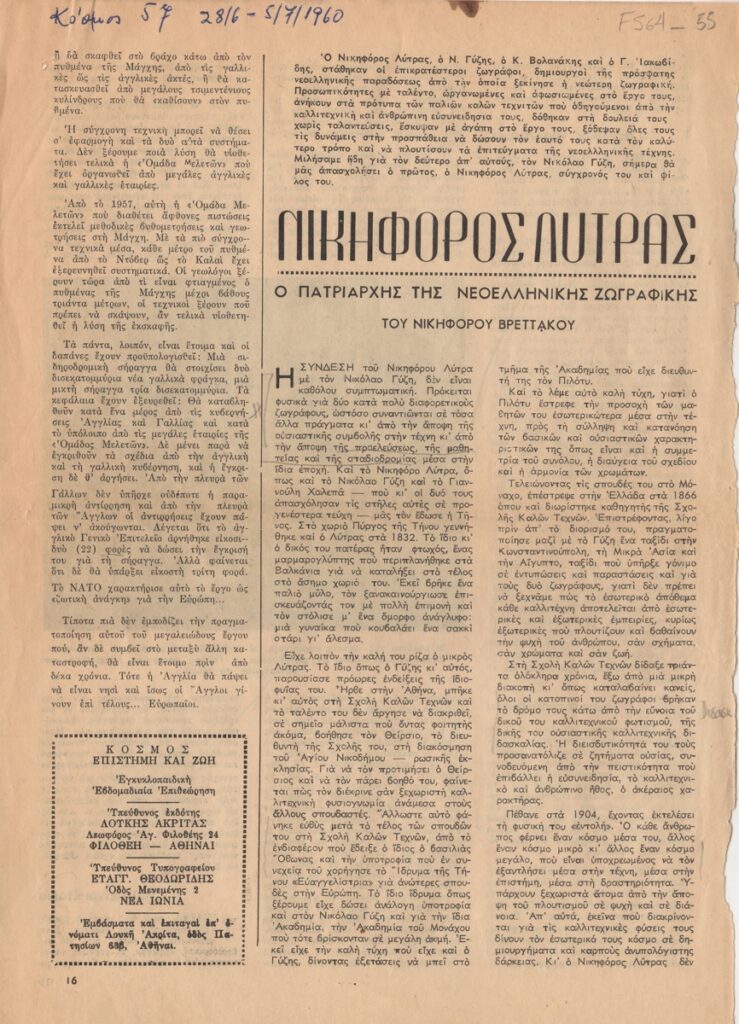 Απόκομμα, χαρτί, 2 φφ, 29,5×21 εκ., στα ελληνικά, δημοσίευσης άρθρου αναφερόμενου στη ζωή και το εικαστικό έργο του Νικηφόρου Λύτρα. Σχολιάζεται το διδασκαλικό του έργο και τα γνωστότερα έργα του.