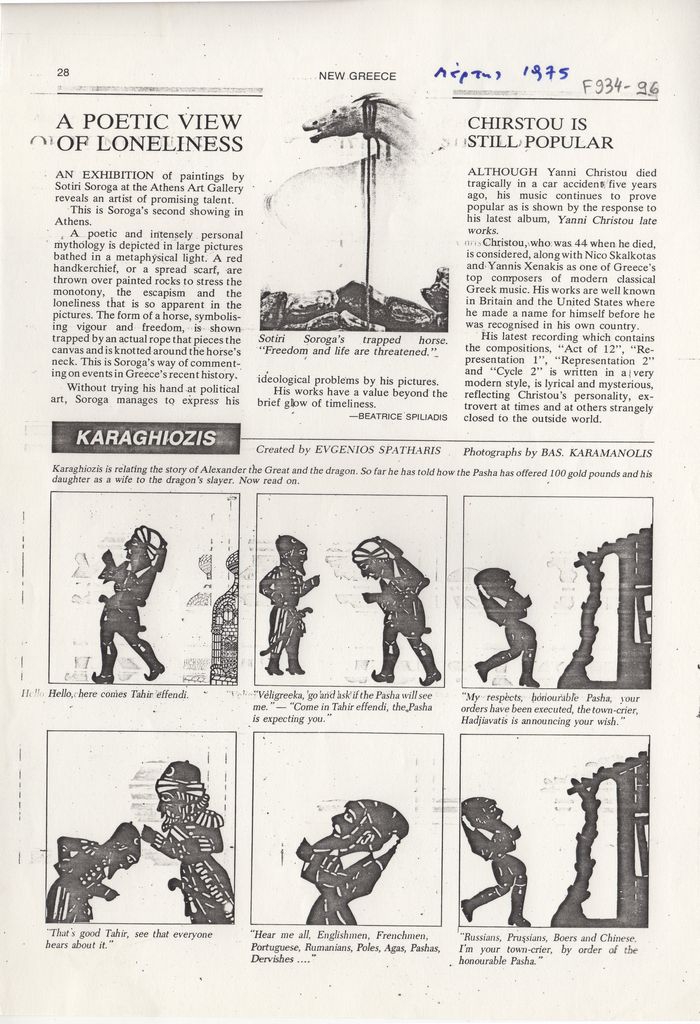 Φωτοαντίγραφο, χαρτί, 29.5×21 εκ., στα αγγλικά, δημοσίευσης κριτικής έκθεσης του Σωτήρη Σόρογκα στην Αίθουσα Τέχνης Αθηνών.
