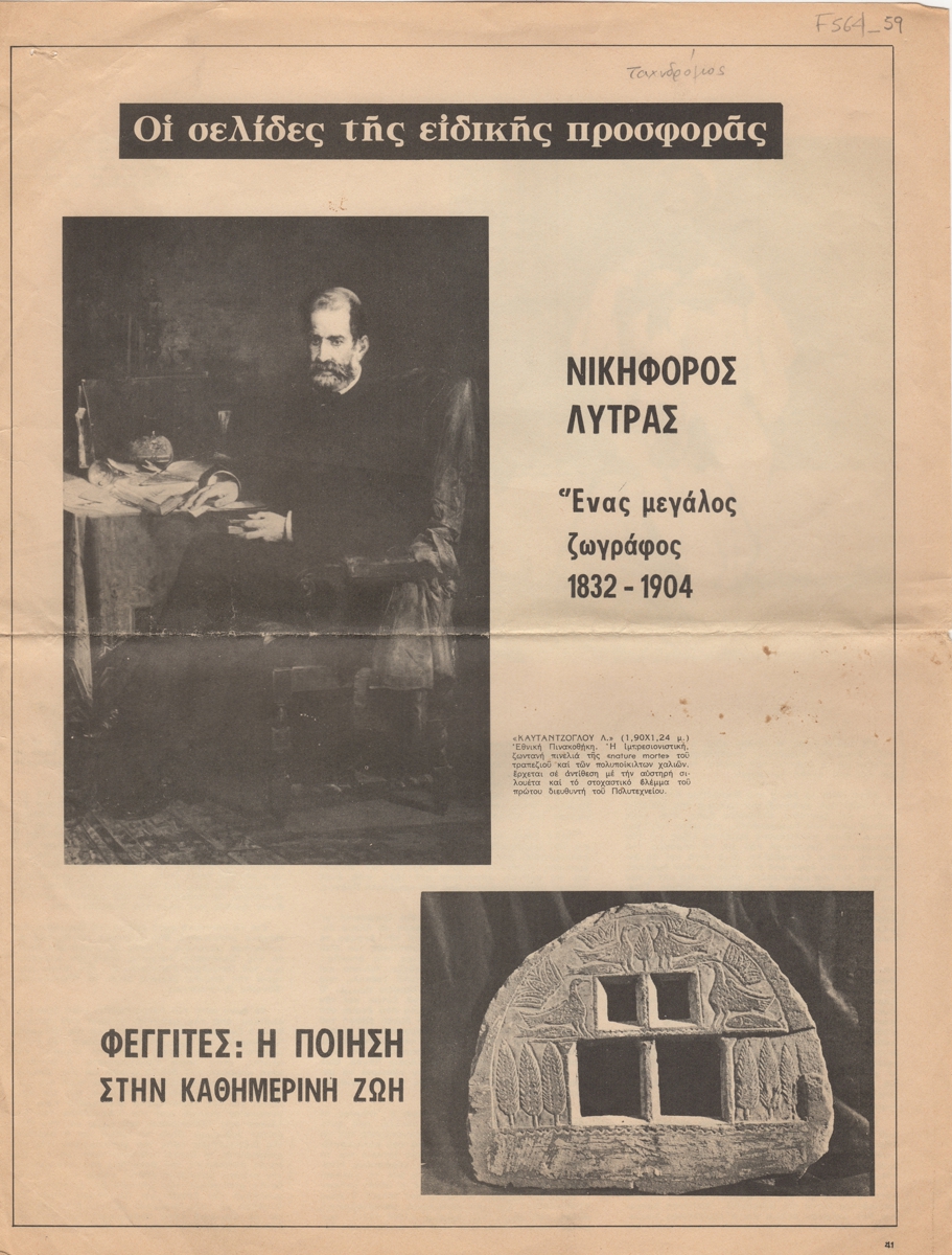 Απόκομμα, χαρτί, 3 φφ, 34×26 εκ., στα ελληνικά, δημοσίευσης άρθρου αναφερόμενου στη ζωή και στο εικαστικό έργο του Νικηφόρου Λύτρα.