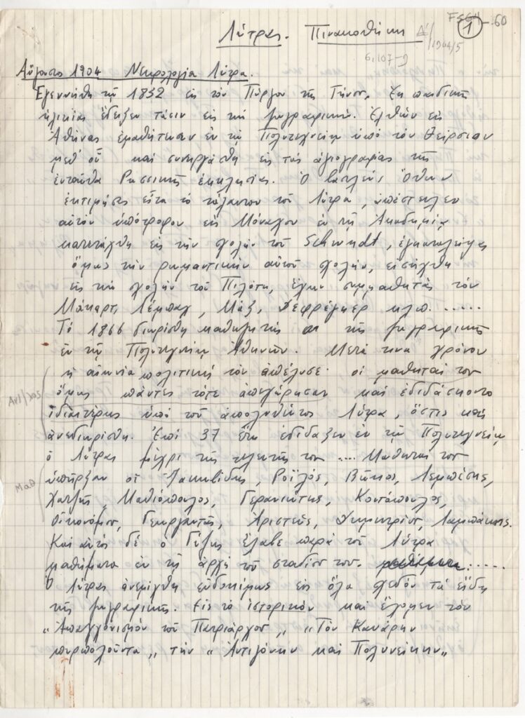 Αποδελτιώσεις, χειρόγραφο, χαρτί, 4 φφ, 28,5×21 εκ., στα ελληνικά, δημοσιεύσεων για τον Νικηφόρο Λύτρα, από το περιοδικό “Πινακοθήκη”. Ειδικότερα, αναγράφεται η νεκρολογία για τον καλλιτέχνη τον Αύγουστο 1904. Ακόμη, ανέκδοτα άρθρα και κριτικές για τον καλλιτέχνη του 1904 και κριτικές της περιόδου 1905-1911.