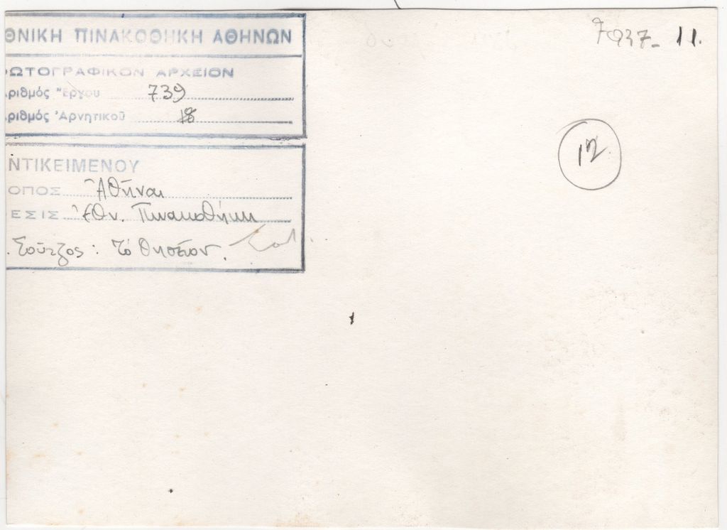 Φωτογραφία, α/μ, φωτογραφικό χαρτί, 11,4×16,0 εκ. Αναπαραγωγή του έργου του Γρηγορίου Σούτζου «Το Θησείον». Στην πίσω όψη σφραγίδα της Εθνικής Πινακοθήκης Αθηνών με συμπληρωμένα τα στοιχεία του έργου.