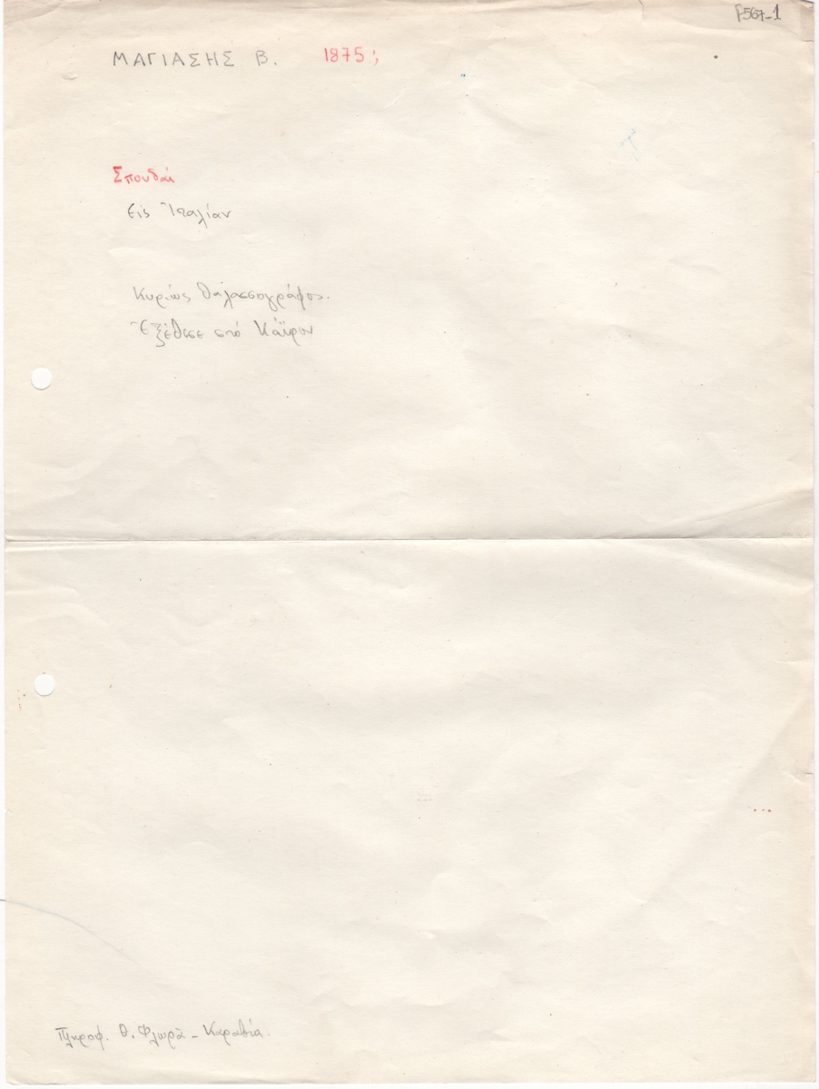 Κείμενο, χειρόγραφο, με μολύβι και κόκκινη ξυλομπογιά, στα ελληνικά, χαρτί, 29,821,3 εκ. Σημειώσεις για τον ζωγράφο Β. Μαγιάση που αναφέρονται στις σπουδές του και στο έργο του. Ως πηγή αναφέρεται η Θ. Φλωρά Καραβία.