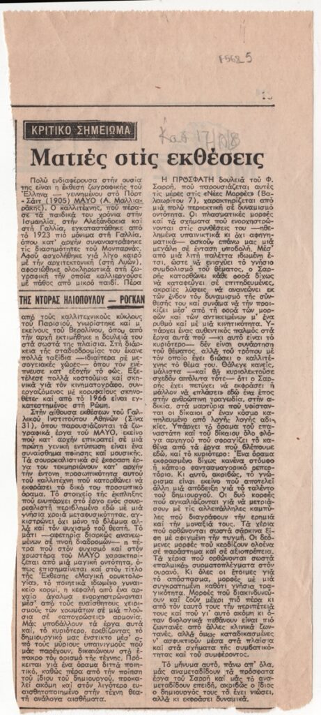 Απόκομμα, έντυπο, στα ελληνικά, χαρτί, 26,7×11,5 εκ. Κριτική της Ντόρας Ηλιοπούλου Ρογκάν για την ατομική έκθεση ζωγραφικής στην Αθήνα το 1983. Η κριτική εντάσσεται στη στήλη “Ματιές στις εκθέσεις”. Επάνω, επιγραφή με τα στοιχεία της δημοσίευσης.