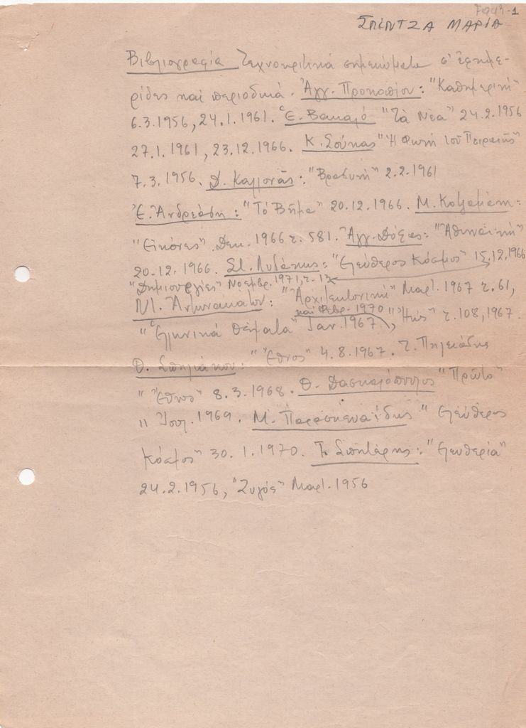 Κείμενο, χειρόγραφο, με μολύβι, στα ελληνικά, χαρτί, 28,8×21,0 εκ. Βιβλιογραφία (τεχνοκριτικά σημειώματα σε εφημερίδες και περιοδικά) για τη ζωγράφο Μαρία Σπέντζα.