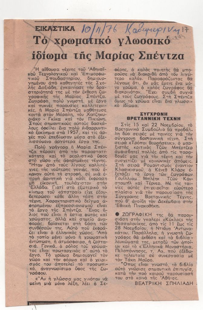 Απόκομμα, έντυπο, χαρτί, 16,8×11,4 εκ., όπου δημοσιεύεται, στα ελληνικά, κριτικό σημείωμα της Βεατρίκης Σπηλιάδη για την ατομική έκθεση ζωγραφικής της Μαρίας Σπέντζα στην Αθήνα το 1976.