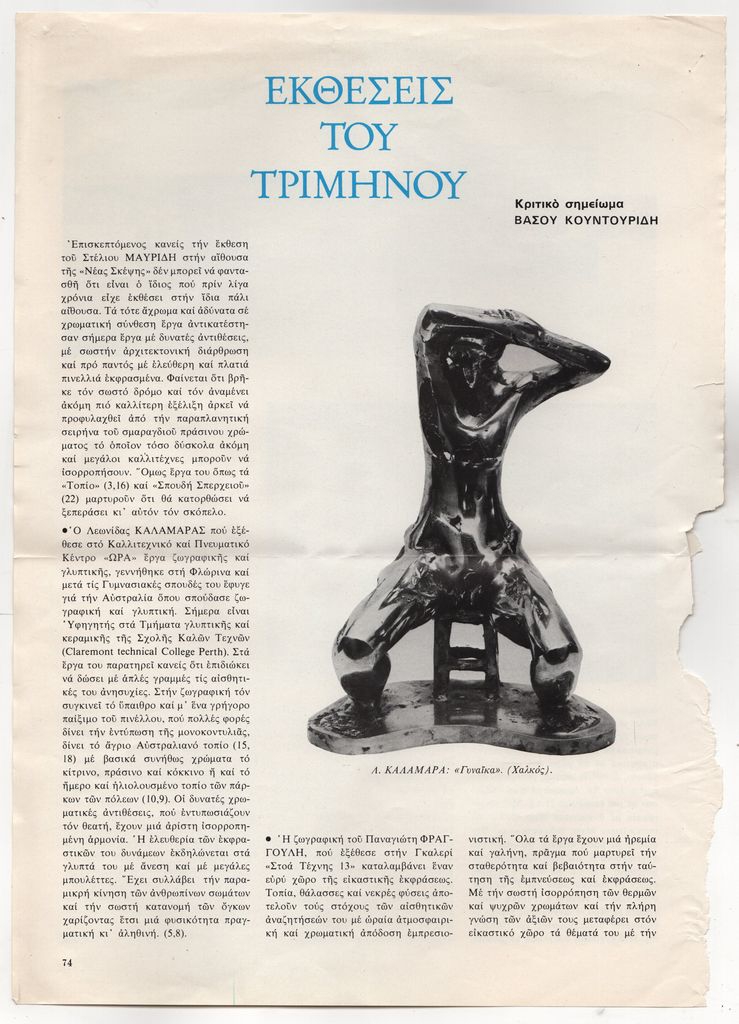 Απόκομμα, έντυπο, χαρτί ιλουστρασιόν, 3 φφ., 33,0×23,5 εκ., όπου δημοσιεύεται, στα ελληνικά, απόσπασμα κριτικού σημειώματος του Βάσου Κουντουρίδη με τίτλο “Εκθέσεις του τριμήνου” (απόσπασμα). Γίνεται αναφορά στις εκθέσεις του Στέλιου Μαυρίδη, του Λεωνίδα Καλαμάρα και του Παναγιώτη Φραγγούλη στην Αθήνα το 1980.