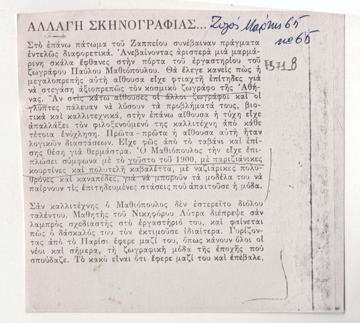 Φωτοαντίγραφο αποκομμάτων περιοδικού, στα ελληνικά, χαρτί, 10,3×11,2 και13,×21,0 εκ. Άρθρο του Περικλή Βυζάντιου με τίτλο “Αλλαγή σκηνογραφίας” για τον ζωγράφο Παύλο Μαθιόπουλο και το εργαστήριό του στις εγκαταστάσεις του Ζαππείου. Επάνω, επιγραφή με τα στοιχεία της δημοσίευσης.