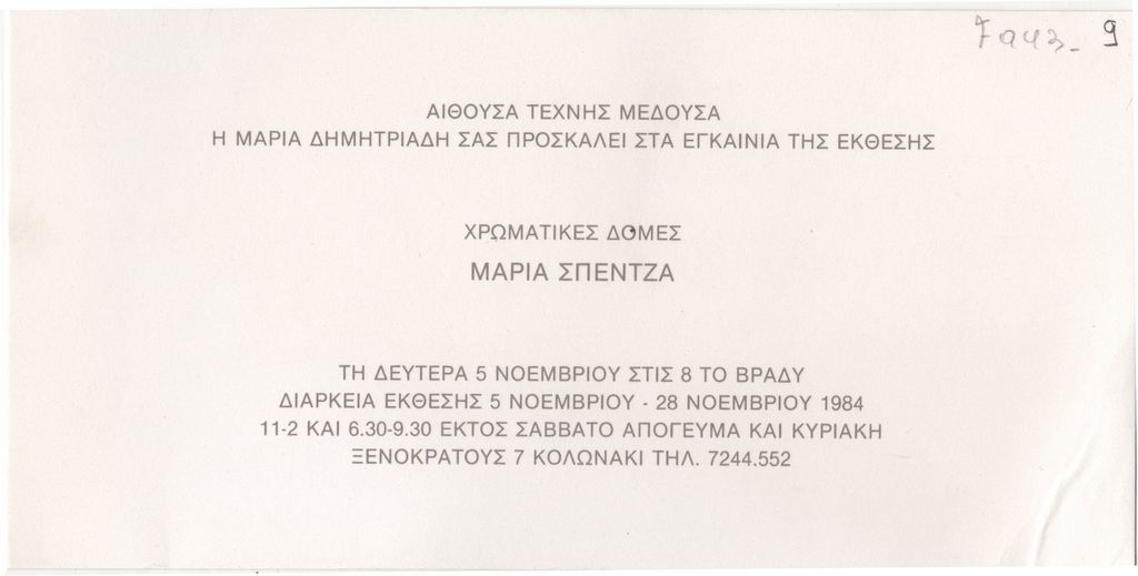 Έντυπο, μονόφυλλο, χαρτόνι, στα ελληνικά, 10,0×19,7 εκ. Πρόσκληση εγκαινίων της ατομικής έκθεσης ζωγραφικής της Μαρίας Σπέντζα με τίτλο «Χρωματικές δομές» στην Αθήνα το 1984.