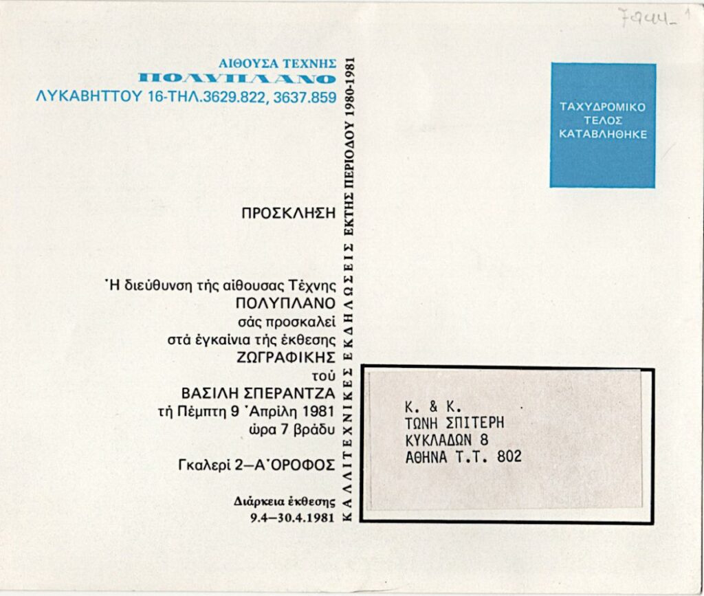 Πρόσκληση της ατομικής έκθεσης ζωγραφικής του Βασίλη Σπεράντζα στην Αίθουσα Τέχνη “Πολύπλανο” στην Αθήνα. Αυτοκόλλητη ετικέτα με δακτυλόγραφα τα στοιχεία του ζεύγους Σπητέρη ως παραληπτών της πρόσκλησης.