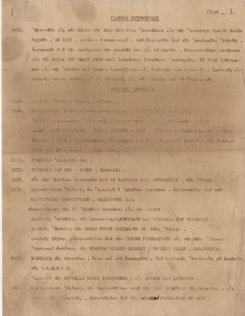 Φωτοαντίγραφο κειμένου, δακτυλόγραφο, στα ελληνικά, χαρτί, 27,8×21,5 εκ., 5 φφ. Βιογραφικό σημείωμα του Γιάννη Σπυρόπουλου οργανωμένο χρονολογικά. Αναφέρονται σπουδές, ομαδικές και ατομικές εκθέσεις, μουσεία και δημαρχειακά μεγαρα που έχουν στη συλλογή τους έργα του, βραβεία και τιμές.