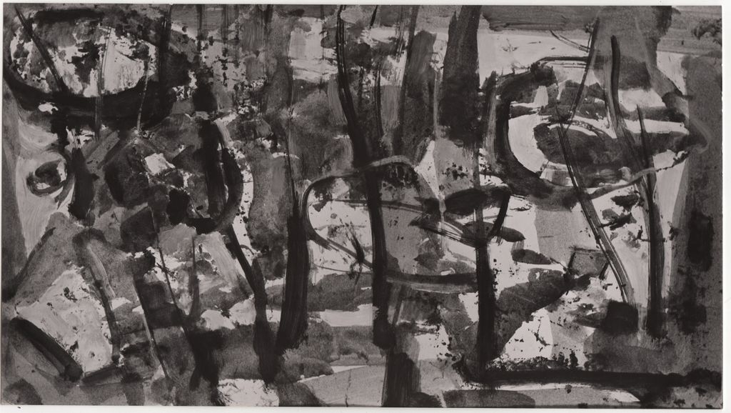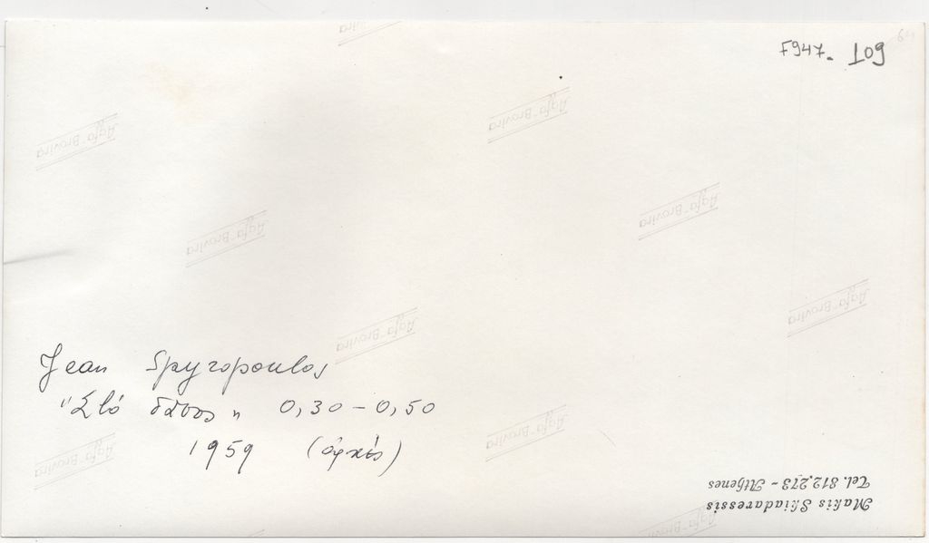 Φωτογραφία, α/μ, φωτογραφικό χαρτί, 13,0×23,2 εκ. Αναπαραγωγή του έργου του Γιάννη Σπυρόπουλου “Στο δάσος”, αρχές 1959. Στην πίσω όψη, επιγραφή με τα στοιχεία του έργου και σφραγίδα του φωτογράφου Μάκη Σκιαδαρέση.