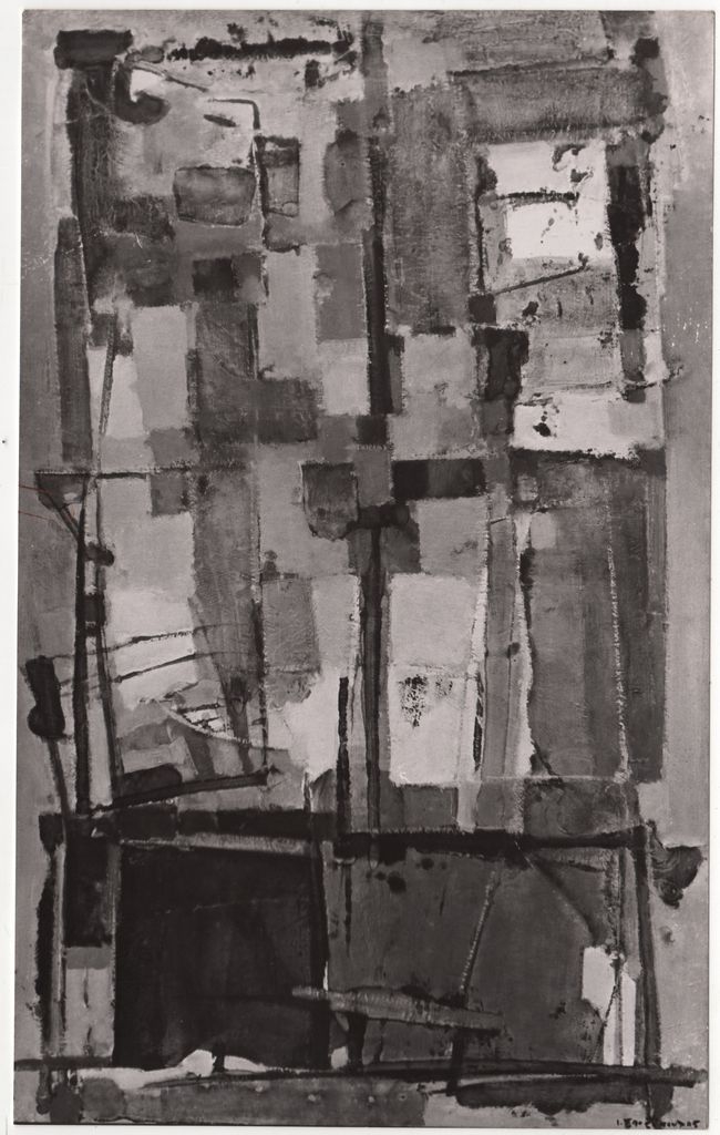 Φωτογραφία, α/μ, φωτογραφικό χαρτί, 23,2×14,4 εκ. Αναπαραγωγή του έργου του Γιάννη Σπυρόπουλου “Σύνθεση R”, 1959. Στην πίσω όψη, επιγραφή με τα στοιχεία του έργου.